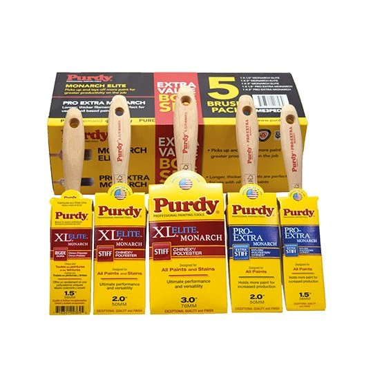 Purdy Monach Elite Set of 5 professional paint brush pack by Purdy which includes 2 x 1.5″, 2 x 2″ and 3″ brush. Each brush is handcrafted with Chinex and Ore synthetic filament and Its thicker filaments work best with thick coatings like emulsion.