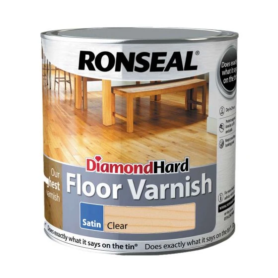 Ronseal Diamond Hard Floor Varnish Clear Satin is a fast-drying water-based floor varnish, designed to protect your wooden floors from shoes, knocks, scuffs, and spills by forming a strong protective coating. This product is very fast drying in only 30 minutes.