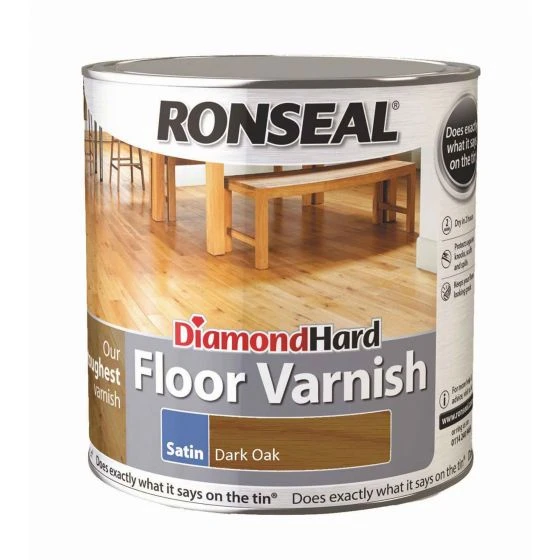 Ronseal Diamond Hard Floor Varnish Dark Oak Satin is a fast-drying water-based floor varnish, designed to protect your wooden floors from shoes, knocks, scuffs, and spills by forming a strong protective coating. This product is very fast drying in only 30 minutes.