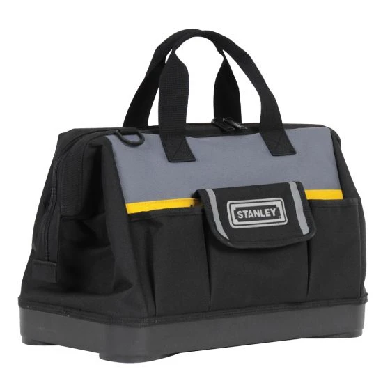 This open mouth toolbag is strong and durable made with 600 denier fabric. IT comes with multiple internal and external pockets for easy organisation and access to tools and a plastic base for better balance. Waterproof and dual zip opening.